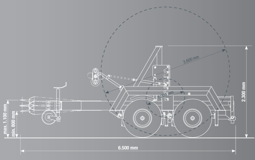 Hydraulische Ausführung, Nutzlast 10.600 kg. U-förmige Bauweise, Tandemfahrgestell druckluftgebremst, mit DIN-Zugöse, Verstellbereich der Kupplungshöhe von 8001100 mm, Heben der Trommel über hydraulische Handpumpe, verstärktes Stützrad, Beleuchtungsanlage 24 Volt, Farbe rot RAL 3020. TÜV abgenommen 80 km/h, ALB-Regler, ABS. Komplett in Standardausführung.