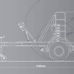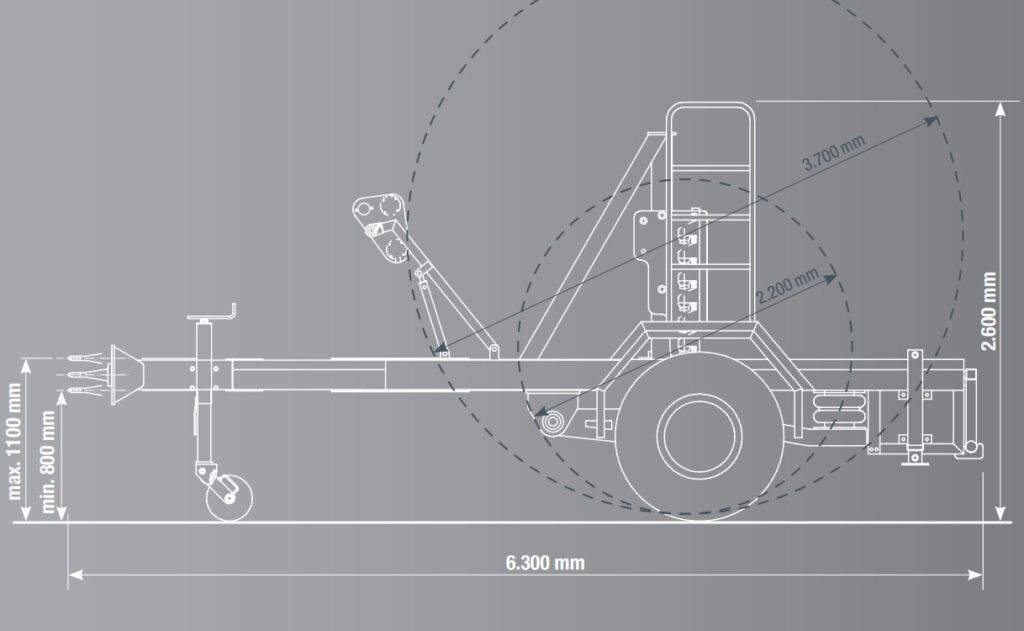 U-förmige Bauweise, Einachsfahrgestell druckluftgebremst, Zugdeichsel mit DIN-Zugöse, Kupplungshöhe 800-1100 mm, Hydraulischer Trommelantrieb mit Tandemantriebswalzen und Heben und Senken der Trommeln über Hydraulikaggregat mit