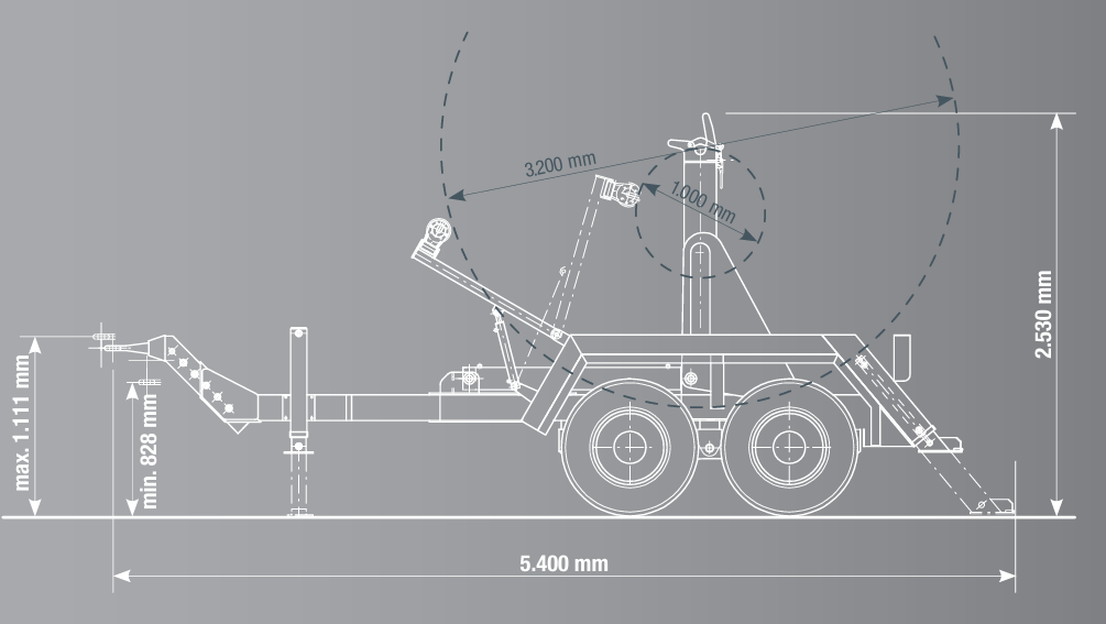 Die Beladung des Fahrzeuges erfolgt durch einen hydraulisch betriebenen Kippladerahmen, über den heckseitig die Trommel über die Achsen ins Fahrzeug gehoben wird. Die Versorgung erfolgt über das Zugfahrzeug. Tandemfahrgestell, druckluftgebremst ABS, TÜV abgenommen, 80 km/h, Beleuchtungsanlage 24 Volt, Farbe rot RAL 3020. Komplett in Standardausführung.