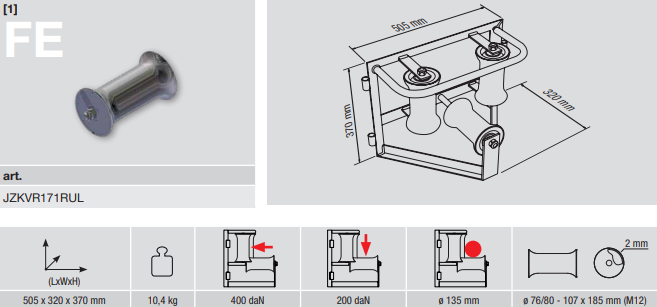 • drei Rollen aus verzinktem Stahl, gelagert mittels doppelt geschützter Kugellager, M12