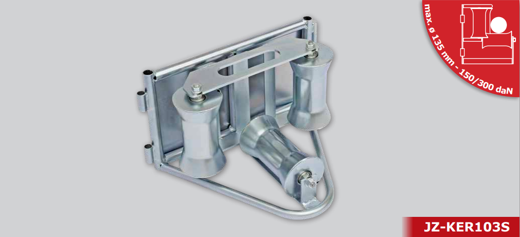 Kabel-Eckrolle, geeignetzum Verlegen von Kabeln bismax. ø 135 mm in Kurven, mit schwingenden vertikalen Rollen. Bestehend aus: