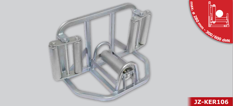 Kabel-Eckrolle, geeignet zum Verlegen von Kabeln bis max. ø 280 mm in Kurven, mit schwingenden vertikalen Rollen. Bestehend aus: