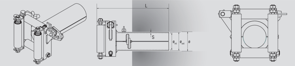 Verzinktes Kabeleinführgerät zum Schutz von Zugseil/Kabel, mit 4 verzinkten Stahlrollen und Spannvorrichtung zur Befestigung im Rohr.