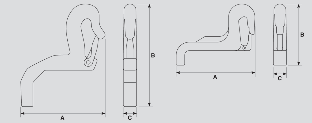 Schnellgreifhaken (Paar) für das Heben von Kabeltrommeln über die zentrale Trommelbohrung, gefertigt aus verzinktem, lackiertem Stahl mit Haken und Sicherheitsverschluss. Einfache Handhabung, schnelle und sichere Montage.