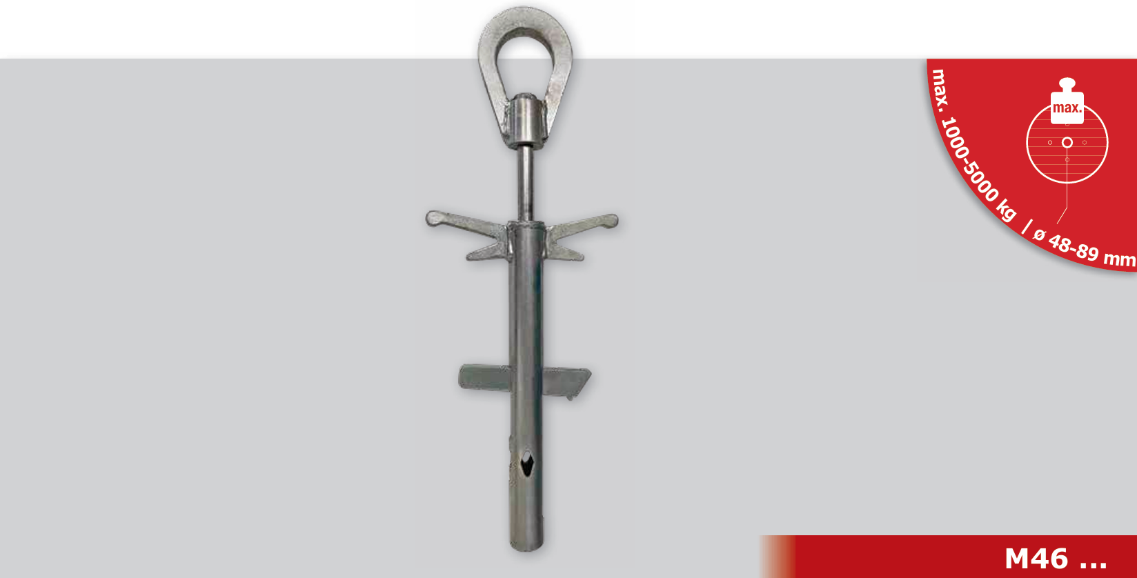 Schnellgreifhaken für das Heben von Kabeltrommeln in horizontaler Lage über die zentrale Trommelbohrung, gefertigt aus