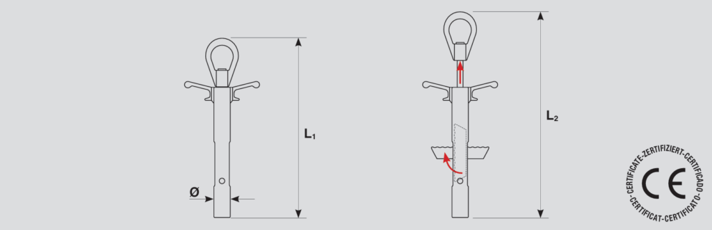 Schnellgreifhaken für das Heben von Kabeltrommeln in horizontaler Lage über die zentrale Trommelbohrung, gefertigt aus