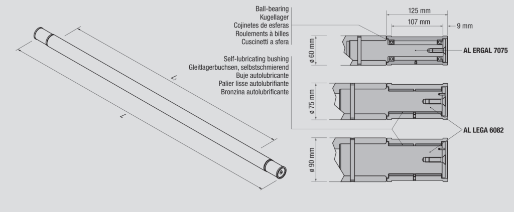 Trommelwelle aus Aluminium, drehbar, mit selbstschmierende Gleitlagerbuchsen. Nuten ideal für die Aufnahme auf standard Kabeltrommel-Hebeböcke.