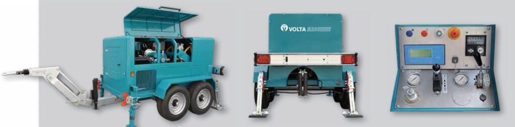 Hydraulische Kabelziehwinde für die unterirdische Verlegung von Kabeln, hydraulischer Antrieb durch einen Dieselmotor. Die maximale Zugkraft wird durch zwei Mehrfachrillenspillköpfe erreicht. Montiert auf einem Fahrgestell, ausgestattet mit einem