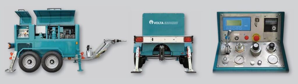 Hydraulische Rohrsanierungswinde, hydraulischer Antrieb durch einen Diesel Motor. Die maximale Zug kraft wird durch zwei Mehr fachrillenspillköpfe erreicht. Montiert auf einem Fahrgestell, ausgestattet mit einem elektronischem Messgerät mit Anzeige der Zugkraft, Geschwindigkeit, verlegten Länge sowie Betriebsstundenzähler. Vorspann Automatik mit konstanter