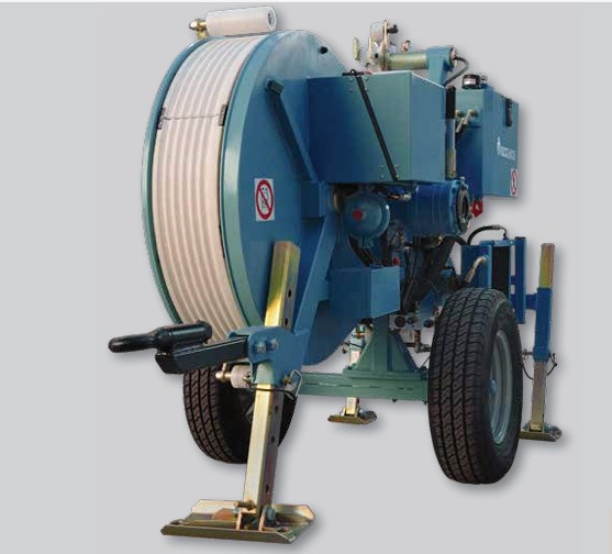 Hydraulische Bremsmaschine geeignet für die Freileitungsverlegung von Stahl- und Leiterseilen sowie OPGW. Die Bremskraft wird durch zwei große, aus hochfestem elastischem Nylonbelag bestehen den Rillenräder übertragen. Über die Rillenräder wird während der Verlegung der Hydraulikkreislauf aktiviert, dadurch kann die Bremskraft stufenlos eingestellt werden; was ein automatisches Anhalten und Wiederanlaufen ermöglicht. Montiert auf einem stabilen Stahlrohrrahmen mit Starrdeichsel, Feststellbremse, vordere und hintere Stützfüße sowie Ösen zur Verankerung. Analoge Geräteausstattung mit Messuhr, Meterzähler sowie Kontrollinstrumente für den Hydraulikkreislauf. Manuelle Negativbremse. Hydrauliköltank mit Wärmetauscher zum Kühlen des Hydrauliköles.
