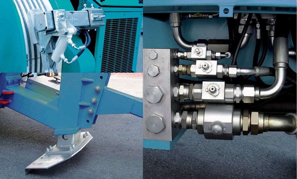 Hydraulische Bremsmaschine geeignet für die Freileitungsverlegung von Stahl- und Leiterseilen sowie OPGW. Die Bremskraft wird durch zwei große, aus hochfestem elastischem Nylonbelag bestehen den Rillenräder übertragen. Über die Rillenräder wird während der Verlegung der Hydraulikkreislauf aktiviert, dadurch kann die Bremskraft stufenlos eingestellt werden; was ein automatisches Anhalten und Wiederanlaufen ermöglicht. Montiert auf einem stabilen Stahlrohrrahmen mit Starrdeichsel, Feststellbremse, vordere und hintere Stützfüße sowie Ösen zur Verankerung. Analoge Geräteausstattung mit Messuhr, Meterzähler sowie Kontrollinstrumente für den Hydraulikkreislauf. Manuelle Negativbremse. Hydrauliköltank mit Wärmetauscher zum Kühlen des Hydrauliköles.