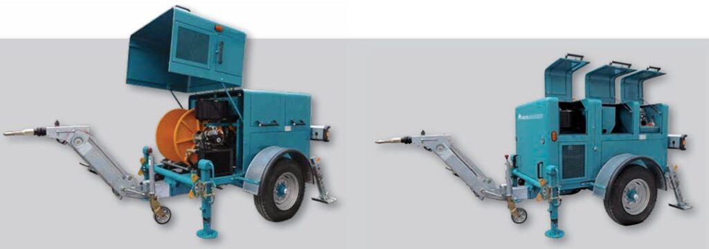 Hydraulische Rohrsanie rungswinde, hydraulischer Antrieb durch einen Diesel motor. Die maximale Zug kraft wird durch zwei Mehr fachrillenspillköpfe erreicht. Montiert auf einem Fahrge stell, ausgestattet mit einem elektronischem Messgerät mit Anzeige der Zugkraft, Geschwindigkeit, verlegten Länge sowie Betriebs stundenzähler. Vorspann automatik mit konstanter