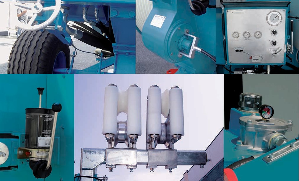 Hydraulische Bremsmaschine geeignet für die Freileitungsverlegung von Stahl- und Leiterseilen sowie OPGW. Die Bremskraft wird durch zwei große, aus hochfestem elastischem Nylonbelag bestehen den Rillenräder übertragen. Über die Rillenräder wird während der Verlegung der Hydraulikkreislauf aktiviert, dadurch kann die Bremskraft stufenlos eingestellt werden; was ein automatisches Anhalten und Wiederanlaufen ermöglicht. Montiert auf einem stabilen Stahlrohrrahmen mit Starrdeichsel, Feststellbremse, vordere und hintere Stützfüße sowie Ösen zur Verankerung. Analoge Geräteausstattung mit Messuhr, Meterzähler sowie Kontrollinstrumente für den Hydraulikkreislauf. Manuelle Negativbremse. Hydrauliköltank mit Wärmetauscher zum Kühlen des Hydrauliköles.
