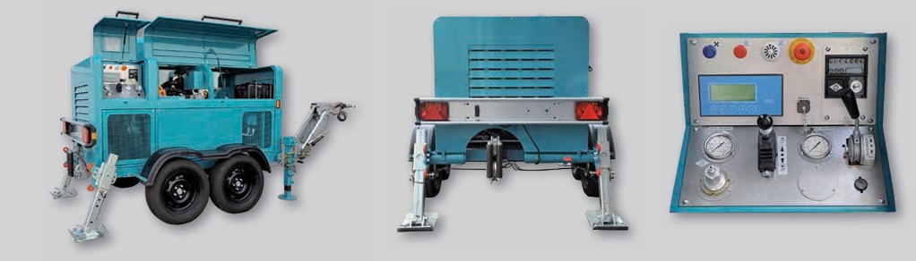 Hydraulische Kabelziehwinde für die unterirdische Verlegung von Kabeln, hydraulischer Antrieb durch einen Dieselmotor. Die maximale Zugkraft wird durch zwei Mehrfachrillenspillköpfe erreicht. Montiert auf einem Fahrgestell, ausgestattet mit einem