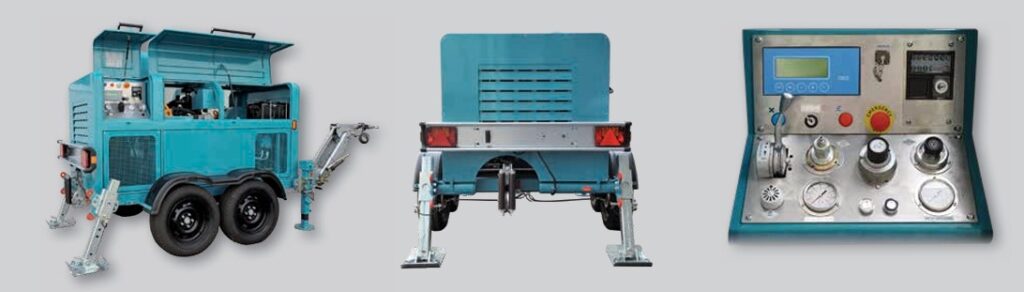 Hydraulische Rohrsanierungswinde, hydraulischer Antrieb durch einen Diesel Motor. Die maximale Zug kraft wird durch zwei Mehr fachrillenspillköpfe erreicht. Montiert auf einem Fahrgestell, ausgestattet mit einem elektronischem Messgerät mit Anzeige der Zugkraft, Geschwindigkeit, verlegten Länge sowie Betriebsstundenzähler. Vorspann Automatik mit konstanter