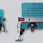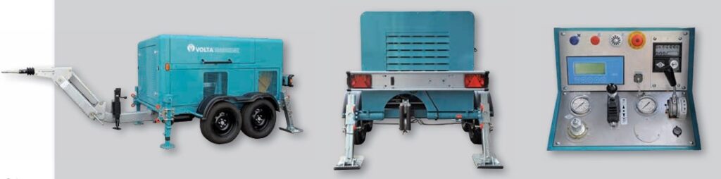 Hydraulische Kabelziehwinde für die unterirdische Verlegung von Kabeln, hydraulischer Antrieb durch einen Dieselmotor. Die maximale Zugkraft wird durch zwei Mehrfachrillenspillköpfe erreicht. Montiert auf einem Fahrgestell, ausgestattet mit einem
