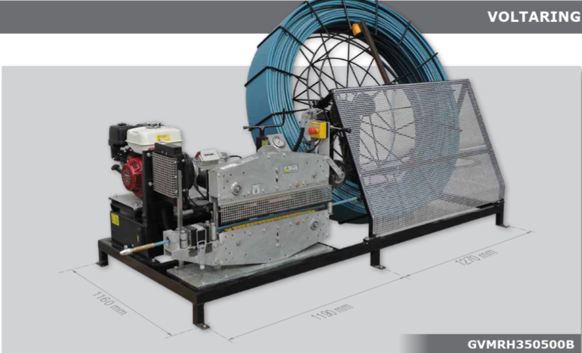 Das mobile Röhrenschlangen-Vorschubgerät VOLTA- RING ist ein stabiles und kompakt gebautes Schub- gerät für Röhrenschlangen bis Ø 15 mm. Der Antrieb erfolgt hydraulisch über einen Verbrennungsmotor. Das Gerät mit Grundrahmen, aufgebautem Hydraulikaggregat, drehbarer gebremster Haspel und Schubeinheit kann so- wohl in einem Anhänger eingebaut oder als eigenständiges Standgerät eingesetzt werden. Schubkraft: ca. 300 daN. Als Antriebmotor wird wahlweise ein Benzinmotor (Honda GX270 ) oder Dieselmotor (Lombardini 15LD440) eingesetzt.