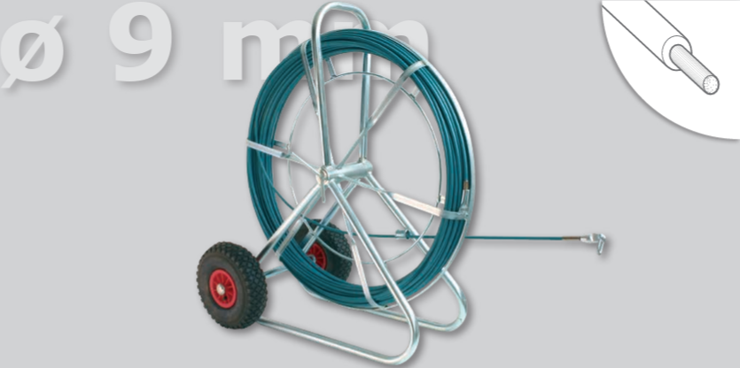 Kabeleinziehgerät VOLTASTRONG mit Glasfaserstab ø 9,0 mm mit Polypropylen-Ummantelung, komplett mit Anfangs/Endhülse M12 und Anfangsbirne mit Schäkel. Aufgespult auf verzinkter, fahrbarer Stahlhaspel in senkrechter Ausführung mit Korbdurchmesser 1000 mm.