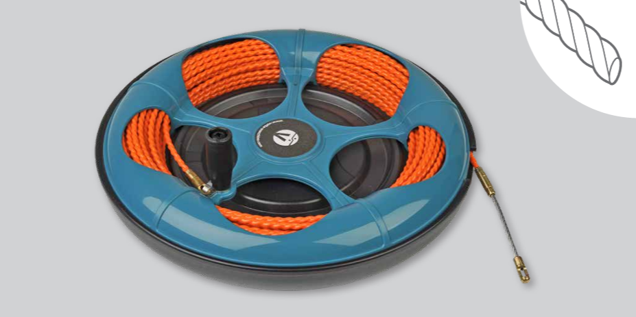 VORTICVOLTA Kabeleinzugsystem mit ø 4 – 4,5 mm verdrilltem VOLTATWISTPolyesterband (PET), komplett mit Anfangs/Endstücke M5, flexibler Anfangsbirne mit Öse und Zugkopf mit Öse; aus- tauschbar.